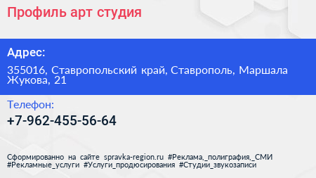 Профиль, арт-студия по адресу 355016, Ставропольский край, Ставрополь, Маршала Жукова, 21 в дальнейшем Организация, размещена в следующих категориях: