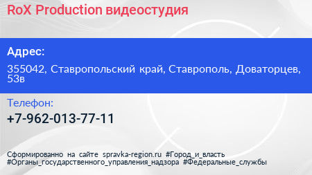 RoX Production, видеостудия по адресу 355042, Ставропольский край, Ставрополь, Доваторцев, 53в в дальнейшем Организация, размещена в следующих категориях: