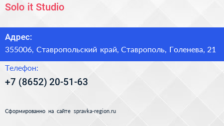 Solo-it Studio по адресу 355006, Ставропольский край, Ставрополь, Голенева, 21 в дальнейшем Организация, размещена в следующих категориях:
