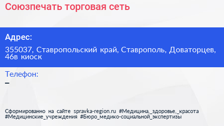 Союзпечать, торговая сеть по адресу 355037, Ставропольский край, Ставрополь, Доваторцев, 46в киоск в дальнейшем Организация, размещена в следующих категориях: