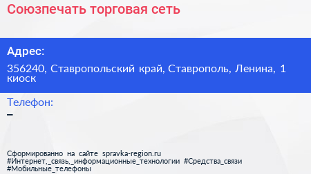 Союзпечать, торговая сеть по адресу 356240, Ставропольский край, Ставрополь, Ленина, 1 киоск в дальнейшем Организация, размещена в следующих категориях: