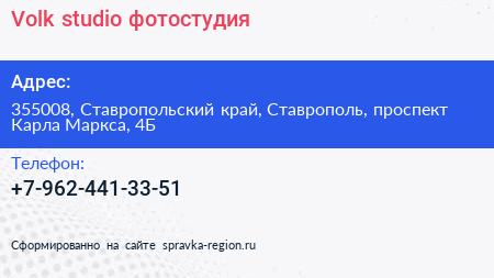 Volk studio, фотостудия по адресу 355008, Ставропольский край, Ставрополь, проспект Карла Маркса, 4Б в дальнейшем Организация, размещена в следующих категориях: