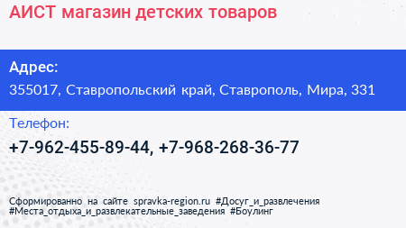 АИСТ, магазин детских товаров по адресу 355017, Ставропольский край, Ставрополь, Мира, 331 в дальнейшем Организация, размещена в следующих категориях: