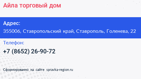 Айла, торговый дом по адресу 355006, Ставропольский край, Ставрополь, Голенева, 22 в дальнейшем Организация, размещена в следующих категориях: