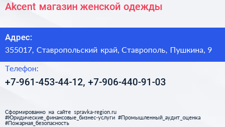 Akcent, магазин женской одежды по адресу 355017, Ставропольский край, Ставрополь, Пушкина, 9 в дальнейшем Организация, размещена в следующих категориях: