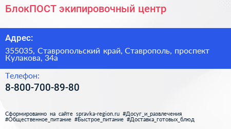 БлокПОСТ, экипировочный центр по адресу 355035, Ставропольский край, Ставрополь, проспект Кулакова, 34а в дальнейшем Организация, размещена в следующих категориях: