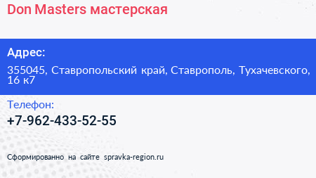 Don Masters, мастерская по адресу 355045, Ставропольский край, Ставрополь, Тухачевского, 16 к7 в дальнейшем Организация, размещена в следующих категориях: