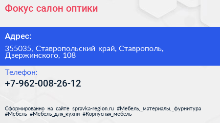 Фокус, салон оптики по адресу 355035, Ставропольский край, Ставрополь, Дзержинского, 108 в дальнейшем Организация, размещена в следующих категориях: