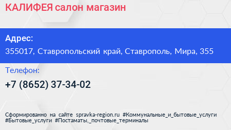 КАЛИФЕЯ, салон-магазин по адресу 355017, Ставропольский край, Ставрополь, Мира, 355 в дальнейшем Организация, размещена в следующих категориях: