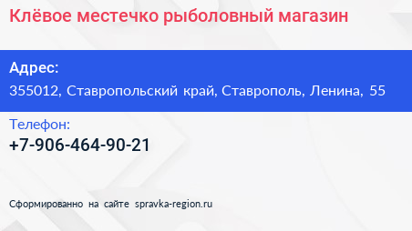 Клёвое местечко, рыболовный магазин по адресу 355012, Ставропольский край, Ставрополь, Ленина, 55 в дальнейшем Организация, размещена в следующих категориях: