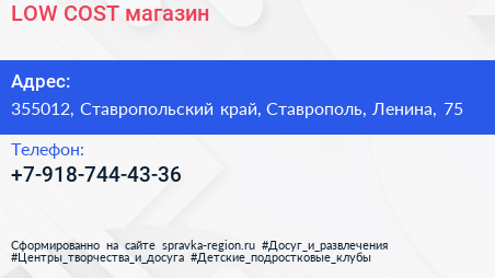LOW COST, магазин по адресу 355012, Ставропольский край, Ставрополь, Ленина, 75 в дальнейшем Организация, размещена в следующих категориях: