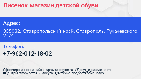 Лисенок, магазин детской обуви по адресу 355032, Ставропольский край, Ставрополь, Тухачевского, 25/4 в дальнейшем Организация, размещена в следующих категориях: