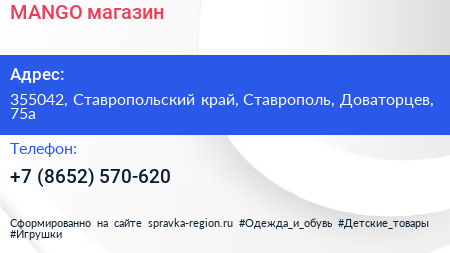 MANGO, магазин по адресу 355042, Ставропольский край, Ставрополь, Доваторцев, 75а в дальнейшем Организация, размещена в следующих категориях: