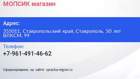 МОПСИК, магазин по адресу 355011, Ставропольский край, Ставрополь, 50 лет ВЛКСМ, 99 в дальнейшем Организация, размещена в следующих категориях: