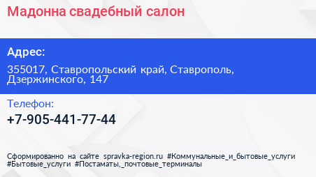 Мадонна, свадебный салон по адресу 355017, Ставропольский край, Ставрополь, Дзержинского, 147 в дальнейшем Организация, размещена в следующих категориях:
