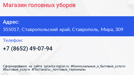 Магазин головных уборов по адресу 355017, Ставропольский край, Ставрополь, Мира, 309 в дальнейшем Организация, размещена в следующих категориях: