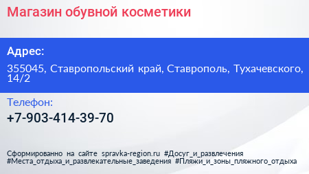 Магазин обувной косметики по адресу 355045, Ставропольский край, Ставрополь, Тухачевского, 14/2 в дальнейшем Организация, размещена в следующих категориях:
