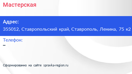 Мастерская по адресу 355012, Ставропольский край, Ставрополь, Ленина, 75 к2 в дальнейшем Организация, размещена в следующих категориях: