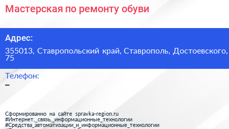 Мастерская по ремонту обуви по адресу 355013, Ставропольский край, Ставрополь, Достоевского, 75 в дальнейшем Организация, размещена в следующих категориях: