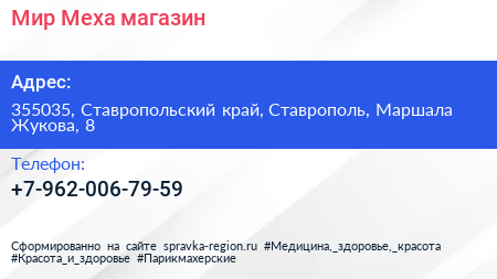 Мир Меха, магазин по адресу 355035, Ставропольский край, Ставрополь, Маршала Жукова, 8 в дальнейшем Организация, размещена в следующих категориях: