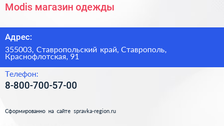 Modis, магазин одежды по адресу 355003, Ставропольский край, Ставрополь, Краснофлотская, 91 в дальнейшем Организация, размещена в следующих категориях: