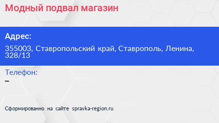 Модный подвал, магазин по адресу 355003, Ставропольский край, Ставрополь, Ленина, 328/13 в дальнейшем Организация, размещена в следующих категориях: