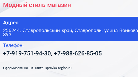 Модный стиль, магазин по адресу 256244, Ставропольский край, Ставрополь, улица Войкова, 393 в дальнейшем Организация, размещена в следующих категориях: