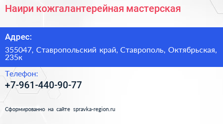 Наири, кожгалантерейная мастерская по адресу 355047, Ставропольский край, Ставрополь, Октябрьская, 235к в дальнейшем Организация, размещена в следующих категориях: