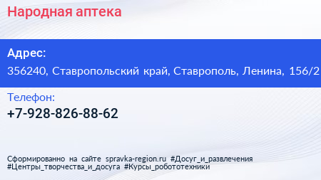 Народная аптека по адресу 356240, Ставропольский край, Ставрополь, Ленина, 156/2 в дальнейшем Организация, размещена в следующих категориях: