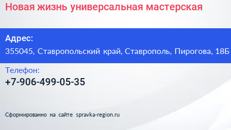 Новая жизнь, универсальная мастерская по адресу 355045, Ставропольский край, Ставрополь, Пирогова, 18Б в дальнейшем Организация, размещена в следующих категориях: