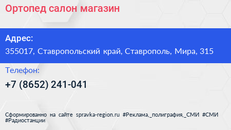 Ортопед, салон-магазин по адресу 355017, Ставропольский край, Ставрополь, Мира, 315 в дальнейшем Организация, размещена в следующих категориях: