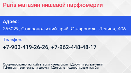 Paris, магазин нишевой парфюмерии по адресу 355029, Ставропольский край, Ставрополь, Ленина, 406 в дальнейшем Организация, размещена в следующих категориях: