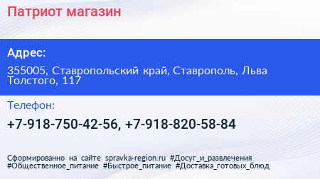 Патриот, магазин по адресу 355005, Ставропольский край, Ставрополь, Льва Толстого, 117 в дальнейшем Организация, размещена в следующих категориях: