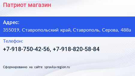 Патриот, магазин по адресу 355019, Ставропольский край, Ставрополь, Серова, 488а в дальнейшем Организация, размещена в следующих категориях: