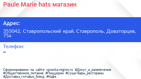 Paule & Marie hats, магазин по адресу 355042, Ставропольский край, Ставрополь, Доваторцев, 75а в дальнейшем Организация, размещена в следующих категориях: