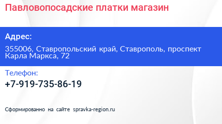 Павловопосадские платки, магазин по адресу 355006, Ставропольский край, Ставрополь, проспект Карла Маркса, 72 в дальнейшем Организация, размещена в следующих категориях:
