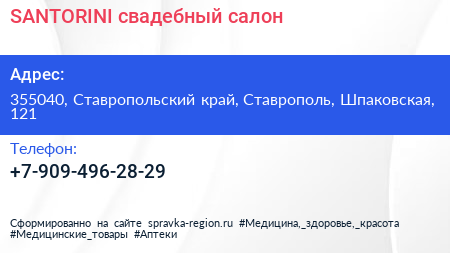 SANTORINI, свадебный салон по адресу 355040, Ставропольский край, Ставрополь, Шпаковская, 121 в дальнейшем Организация, размещена в следующих категориях: