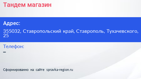 Тандем, магазин по адресу 355032, Ставропольский край, Ставрополь, Тухачевского, 25 в дальнейшем Организация, размещена в следующих категориях: