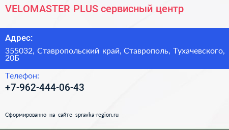 VELOMASTER-PLUS, сервисный центр по адресу 355032, Ставропольский край, Ставрополь, Тухачевского, 20Б в дальнейшем Организация, размещена в следующих категориях:
