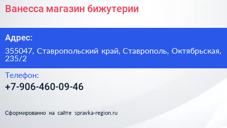 Ванесса, магазин бижутерии по адресу 355047, Ставропольский край, Ставрополь, Октябрьская, 235/2 в дальнейшем Организация, размещена в следующих категориях: