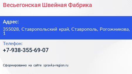 Весьегонская Швейная Фабрика по адресу 355028, Ставропольский край, Ставрополь, Рогожникова, 1 в дальнейшем Организация, размещена в следующих категориях: