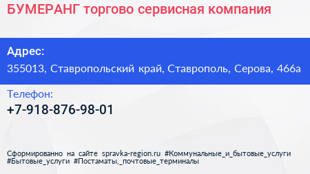 БУМЕРАНГ, торгово-сервисная компания по адресу 355013, Ставропольский край, Ставрополь, Серова, 466а в дальнейшем Организация, размещена в следующих категориях:
