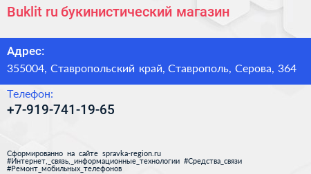 Buklit.ru, букинистический магазин по адресу 355004, Ставропольский край, Ставрополь, Серова, 364 в дальнейшем Организация, размещена в следующих категориях: