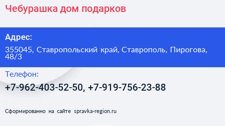 Чебурашка, дом подарков по адресу 355045, Ставропольский край, Ставрополь, Пирогова, 48/3 в дальнейшем Организация, размещена в следующих категориях: