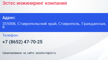Эстес инжиниринг, компания по адресу 355008, Ставропольский край, Ставрополь, Гражданская, 8 в дальнейшем Организация, размещена в следующих категориях: