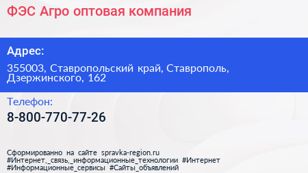 ФЭС-Агро, оптовая компания по адресу 355003, Ставропольский край, Ставрополь, Дзержинского, 162 в дальнейшем Организация, размещена в следующих категориях:
