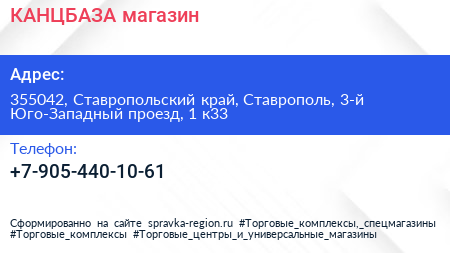 КАНЦБАЗА, магазин по адресу 355042, Ставропольский край, Ставрополь, 3-й Юго-Западный проезд, 1 к33 в дальнейшем Организация, размещена в следующих категориях: