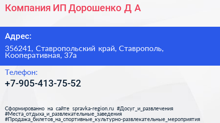 Компания, ИП Дорошенко Д.А. по адресу 356241, Ставропольский край, Ставрополь, Кооперативная, 37а в дальнейшем Организация, размещена в следующих категориях: