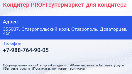 Кондитер PROFI, супермаркет для кондитера по адресу 355037, Ставропольский край, Ставрополь, Доваторцев, 46г в дальнейшем Организация, размещена в следующих категориях: