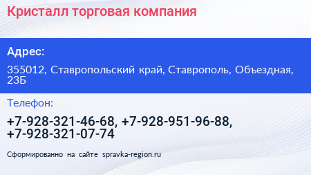 Кристалл, торговая компания по адресу 355012, Ставропольский край, Ставрополь, Объездная, 23Б в дальнейшем Организация, размещена в следующих категориях: